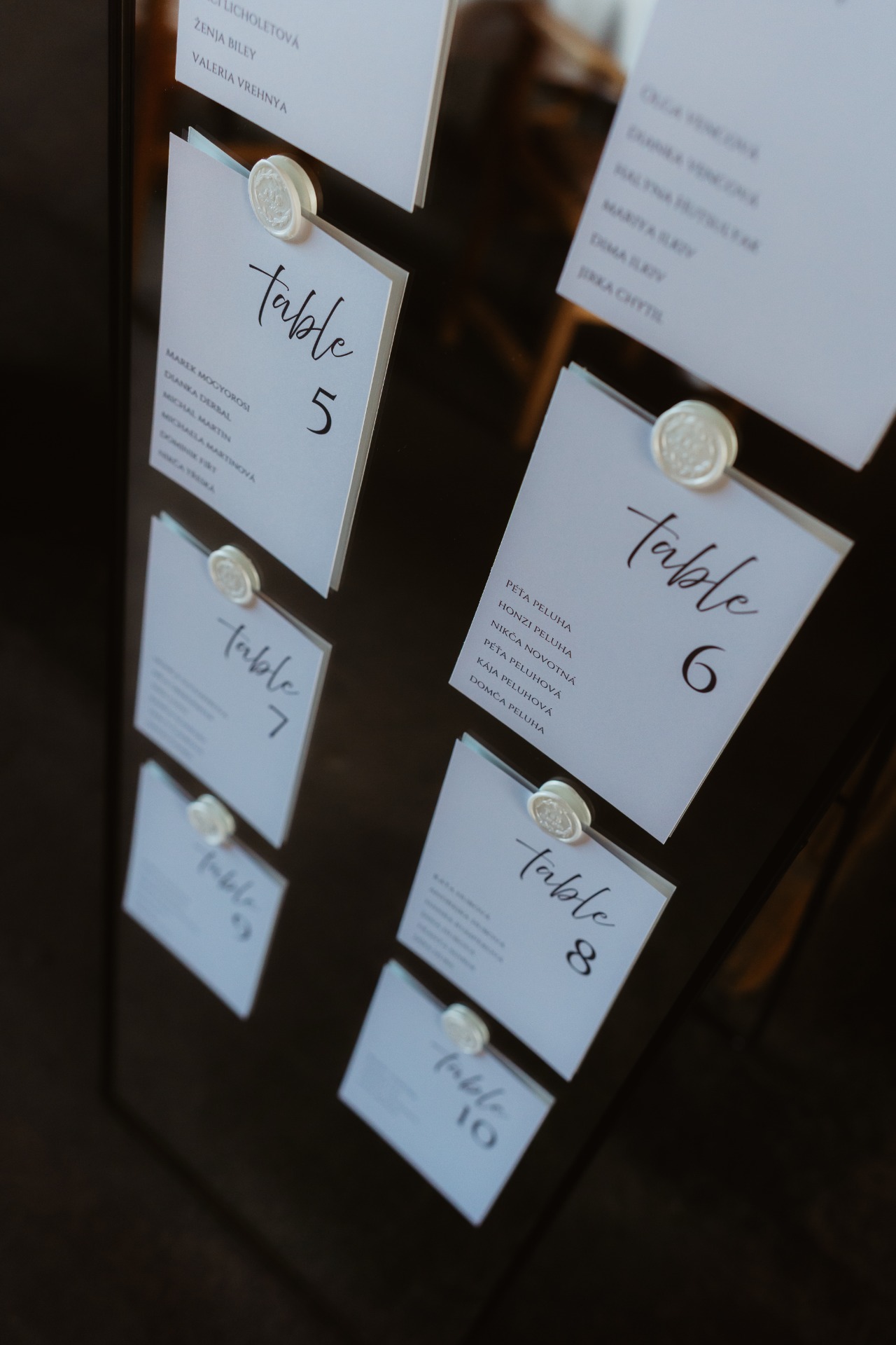 Po skupinovém focení se přesouváme k hostině. Doporučuji mít na stolech jmenovky, ať každý ví kam se má usadit. Pro lepší přehled pro hosty doporučuji mít na ceduli vytisknutý zasedací pořádek se jmény. Ať se každý podívá a jde na jistotu na své místo.